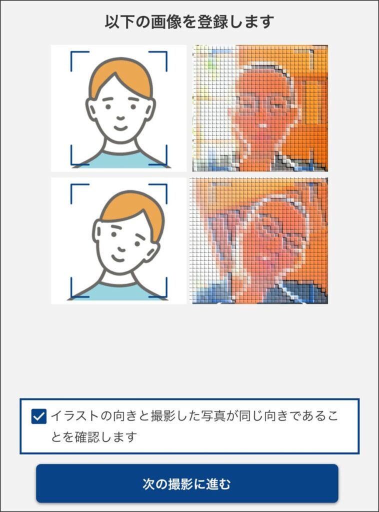 画面の指示に従い、自分の顔を正面から撮影したり、ゆっくり首を振ったりします。