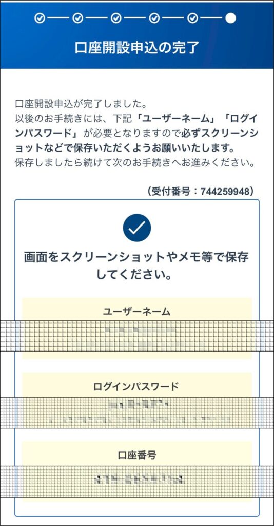 口座開設申込の完了画面が表示され、あなたの「ユーザーネーム」「ログインパスワード」が発行されます。