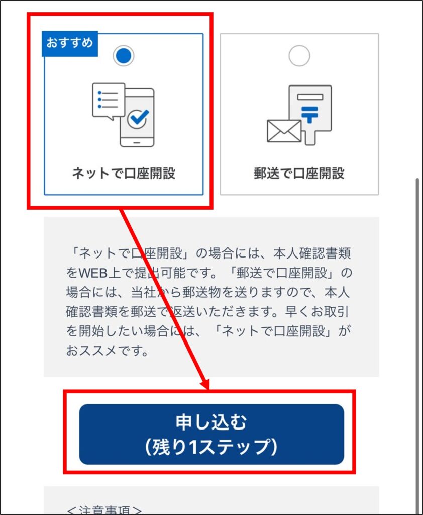 「ネットで口座開設」が選択されていることを確認し、「申し込む」をタップします。